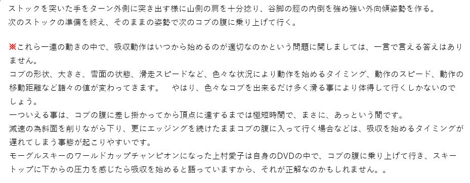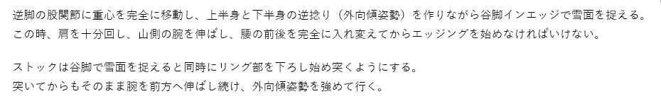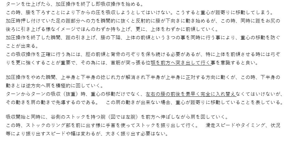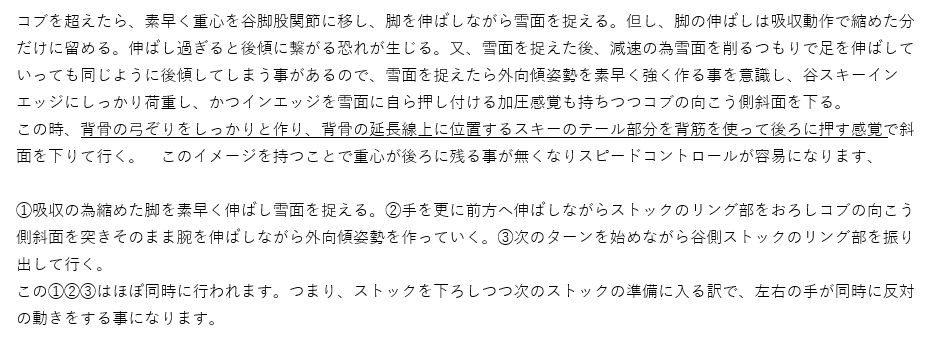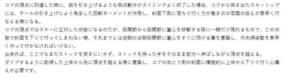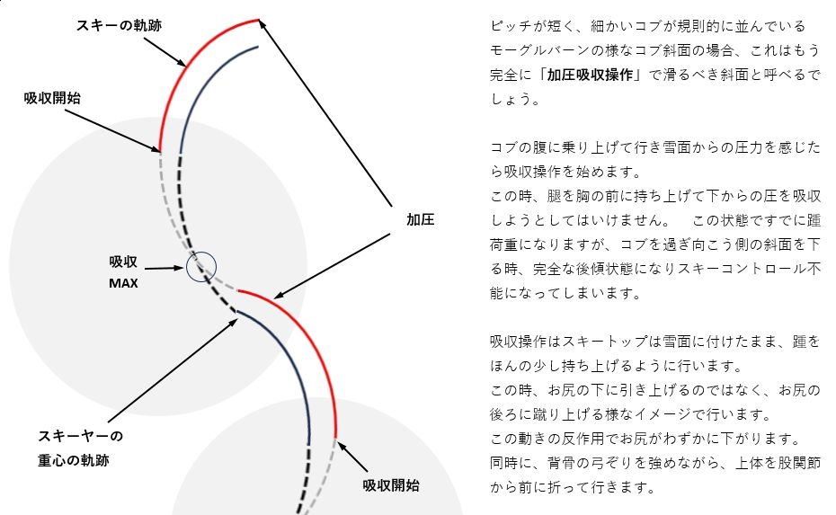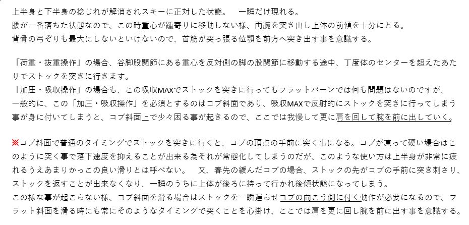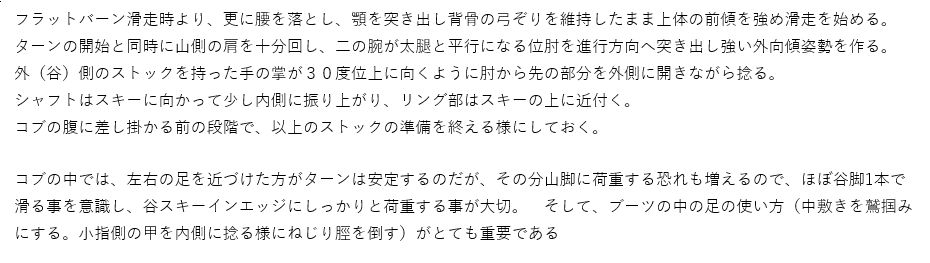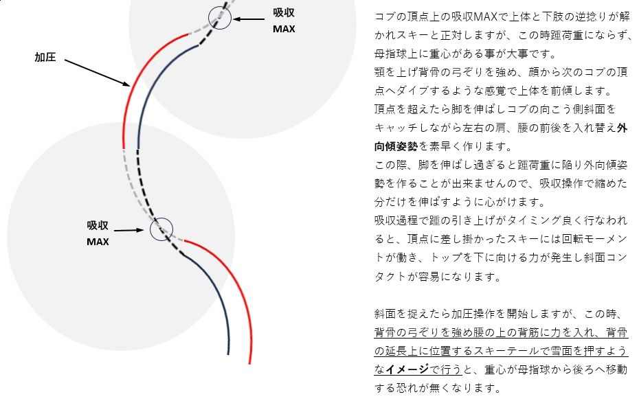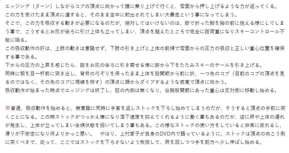 コブ滑走時の体各部の使い方と意識の持ち方、及びストックワーク