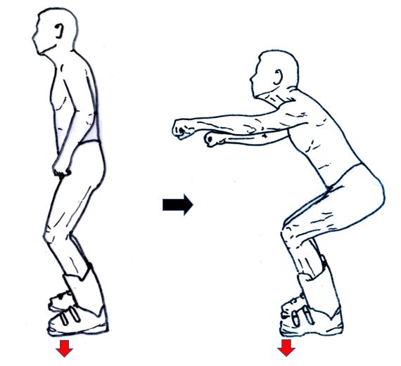 スポーツをするときに履く普通の靴の場合、足首の柔軟性は確保されており前後への動きは制限されていませんので、腰を下げていっても脛の前傾を増してやれば母指球辺りにある重心位置を変化させずに済むのですが、スキーブーツの場合は前傾角度が決まっている為、ある程度以上腰を下げていくと、それに伴って足裏の重心位置は踵方向へ移動してしまう事になります。
