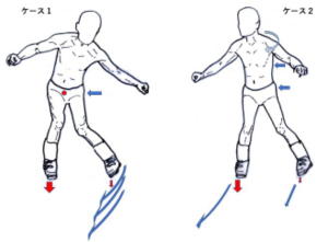 このように重心を高い位置に置いた場合、その地点の移動距離が僅か2〜3pでも足裏の重心位置は10cm程移動してしまう事になり、このようなフォームで滑り続けていると常に踵荷重で滑る事になり、そこから抜け出す事が難しくなってしまいます。
